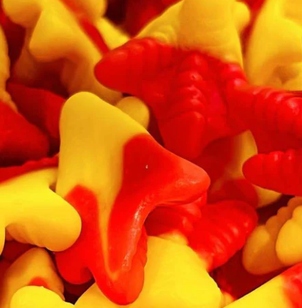 Ingrédients: Sirop de glucose, sucre, eau, amidon, gélatine de bœuf halal, dextrose, acidifiants (E270, E330), agent d'enrobage (huile végétale : palme, E901, E903), arôme artificiel, colorants (E102, E129).